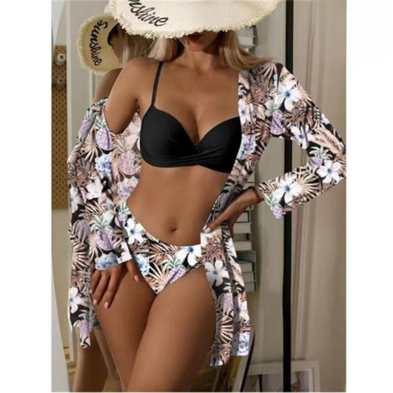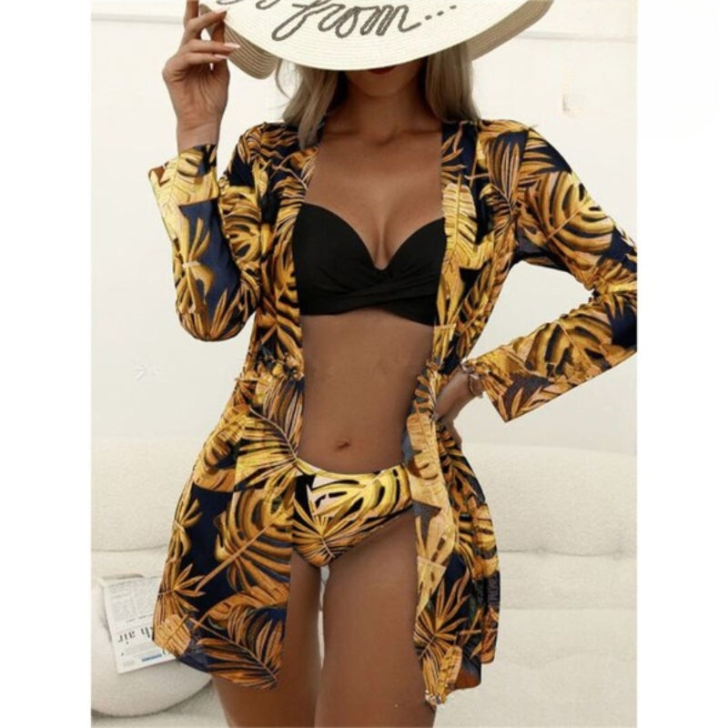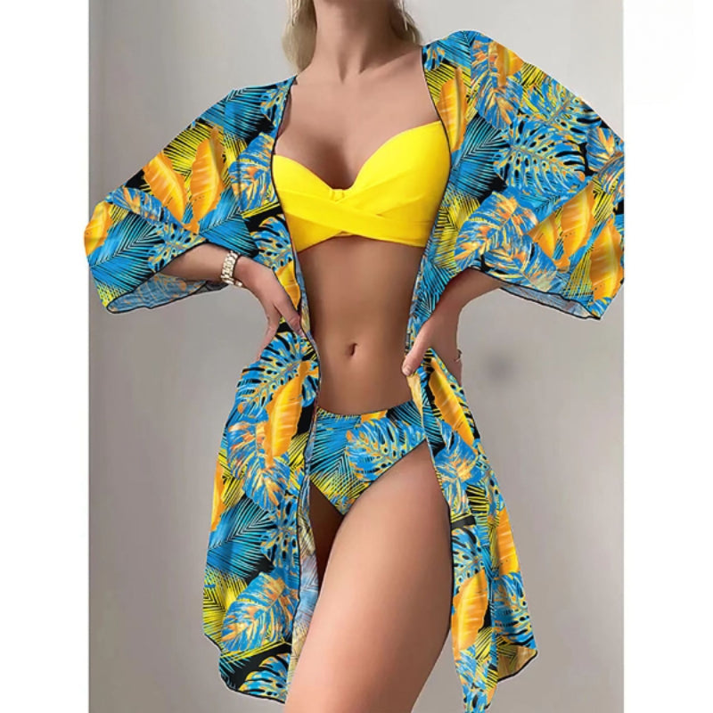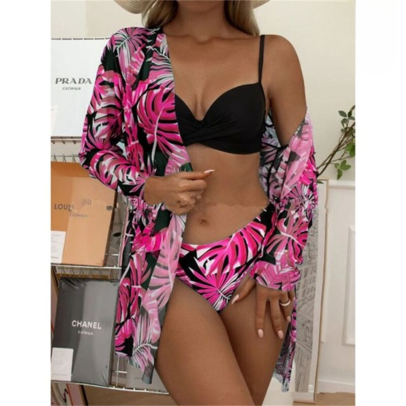 The Multicolor Three Pieces Printed Cover Up Bikini for Women is designed to solve these common swimwear frustrations. This three-piece set offers a stylish and complete look that boosts your confidence with its flattering mid-waist fit and wire-free construction. It’s perfect for lounging by the pool, enjoying a swim in the ocean, or simply soaking up the sun on the beach.