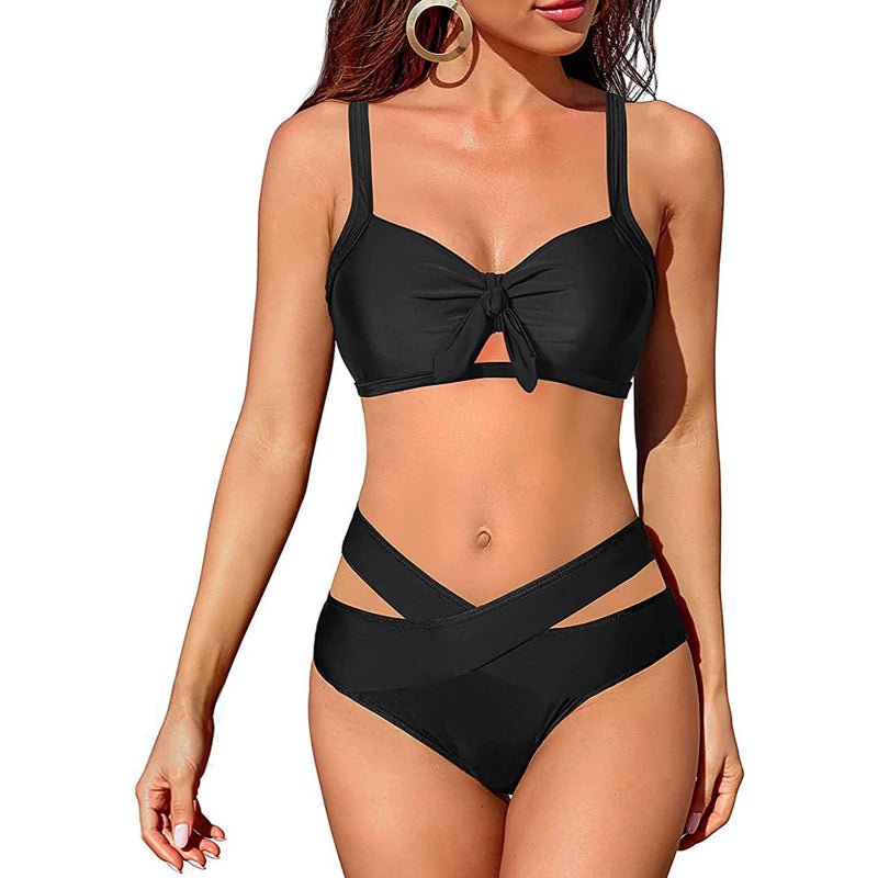 Introducing the Women High Waisted Bathing Suits Tummy Control Push Up Two-Piece Bikini Set Swimsuits—the perfect solution for combining fashion, comfort, and confidence. This set features a stylish crisscross front strap design on the bikini top that not only adds a charming touch but also draws attention effortlessly. The top includes a detachable bra, delivering just the right amount of support while enhancing your natural shape with a subtle push-up effect. Meanwhile, the high-waisted bikini bottoms offer tummy control with ruched sides, expertly hiding any imperfections and providing full coverage that sculpts your curves beautifully.