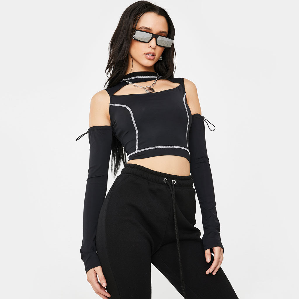 Futuristic Style High Neck Cut Out Long sleeve Crop Top - Black