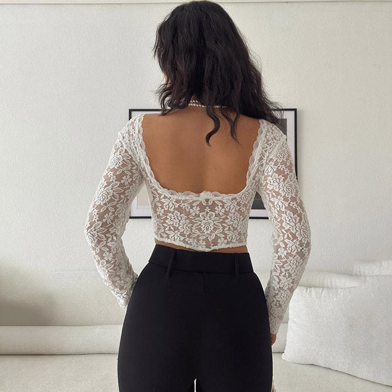 V Neck Long Sleeve Cropped Sheer Floral Lace Top - White