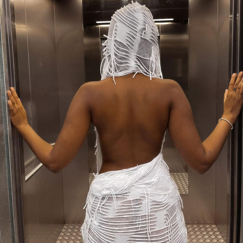 Women's Distressed Sleeveless Low Back Hooded Mini Dress Party Dresses