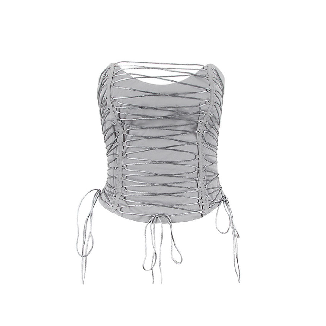 All laced up. This grey strapless top will mesmerize you at first sight. With its unique lace-up design. top stitching seams. and non-slip detailing. it exudes both style and functionality. The sweetheart neckline adds a touch of charm to its sleeveless bodice. while the back zipper ensures easy wear. Crafted from comfortable polyester fabric and fully lined for a polished look. this trendy crop top is perfect for turning heads on a girls' night out or rooftop cocktails. Pair it effortlessly with oversized cargo jeans for an eye-catching ensemble that radiates confidence.