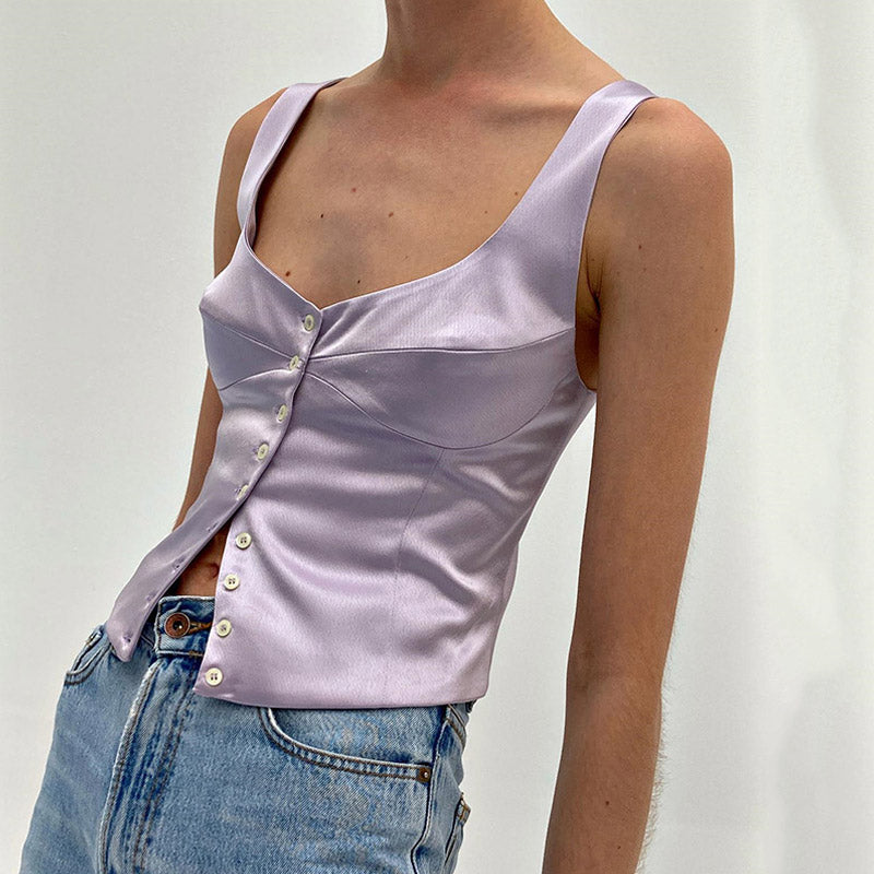 Experience pure indulgence with our satin tank top - the ultimate in luxury fashion. This sleeveless top is designed with a satin gloss finish that adds a touch of sophistication to your look. The chic buttons allow you to wear it opened as a vest. making it a versatile and stylish option. Featuring a square neckline and a tank bodice with two fixed shoulder straps. this trendy top is both comfortable and fashionable. The polyester fabric is not sheer. meaning that there is no lining required. You can enjoy the silky smooth feeling of the fabric against your skin without worrying about transparency. Whether you're dressing up for a special occasion or keeping it casual for a day out. this Satin Tank Top is the perfect choice. Pair it with our coatsandpantsfor a professional look. or withjeansandheelsfor a night out on the town.