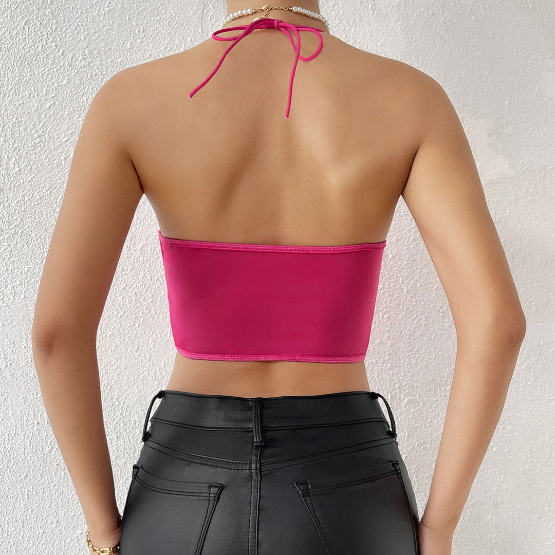 Satin tops are having a major moment in summer. This silky satin corset is anything but basic! Crafted with a crisscross design in the middle and a partially lined ruched bust with neck ties for support. this trendy piece is perfect for making a statement. Delve into the realm of sheer beauty with the semi-sheer mesh back. revealing a hint of skin while exuding an air of subtle sensuality. The kerchief hemline adds a playful and unique twist. creating a stylish and eye-catching look that sets you apart from the crowd.