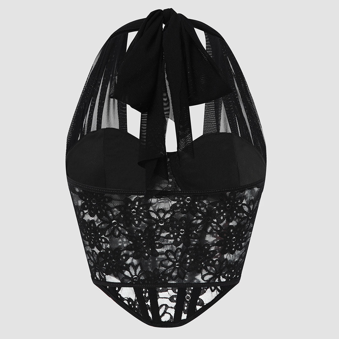 Crossed Halter Neck Lace Floral Mesh Cropped Corset Top - Black