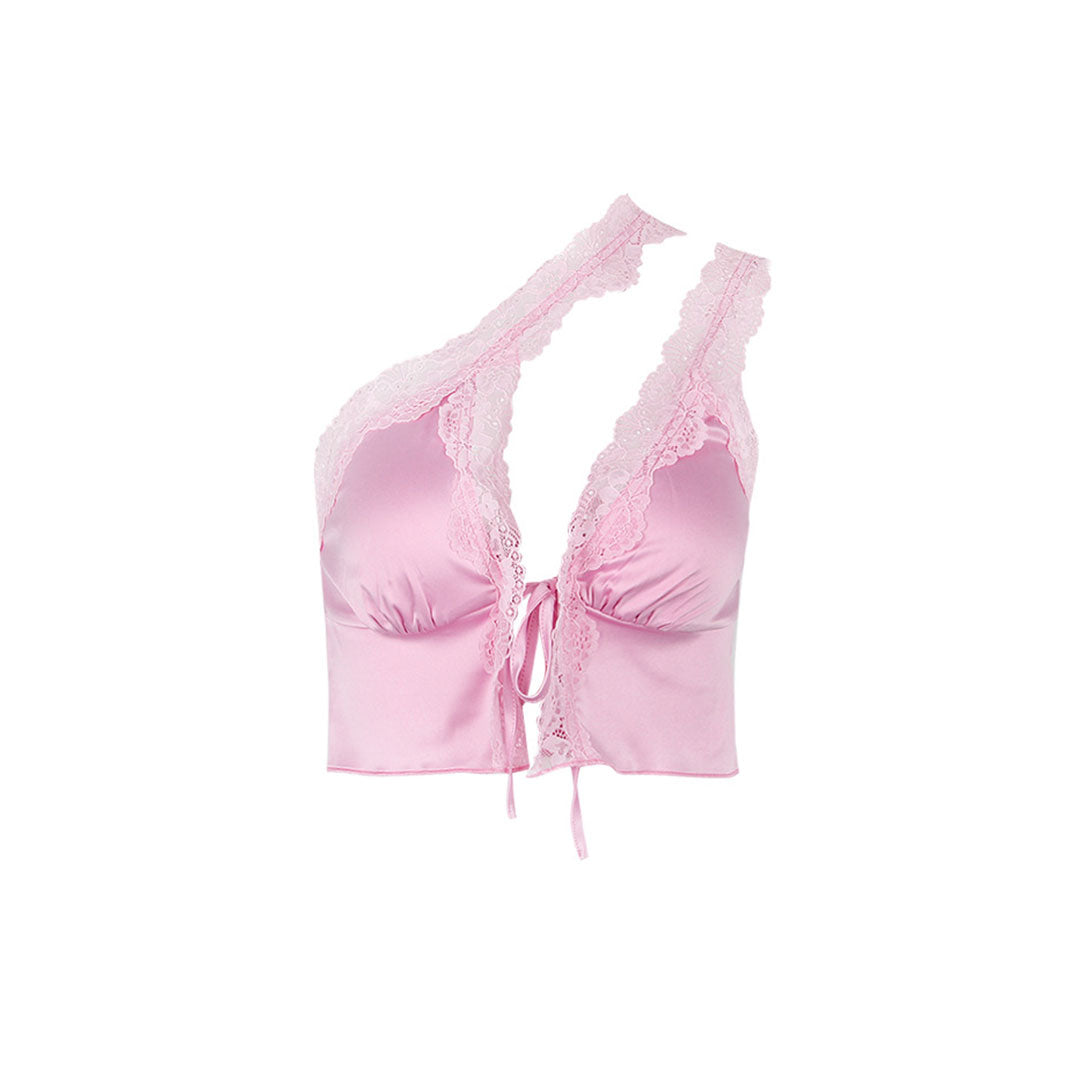 Cutout Tie Front Satin Lace One Shoulder Sleeveless Cropped Top - Pink