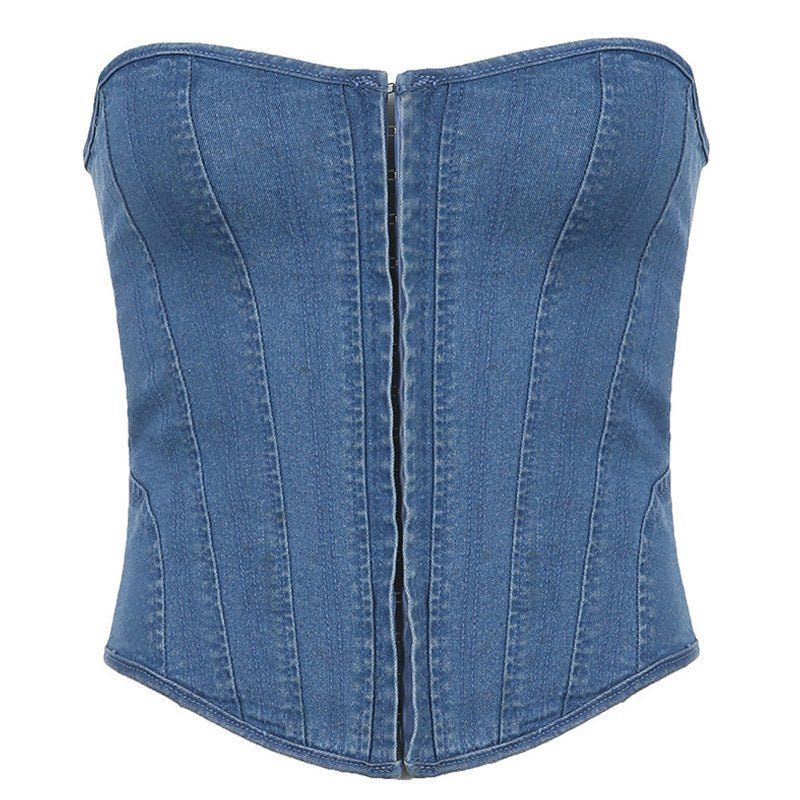 Dare to be different! Set trends and show off your unique style with this retro-inspired strapless denim top. This top is designed with comfort and style in mind. Featuring a sweetheart neckline. slim fit bodice. and topstitching seams. this vintage top will flatter your figure and make a statement. Soft and lightweight denim is spandex. with extra attention to detail in the stitching and closures. to ensure a perfect fit. Secure it with a hook-and-eye closure at the front and a lace-up closure at the back and show off your confidence with a curved hemline. From the sexy neckline to the curved hemline. it's the perfect way to showcase your individuality.
