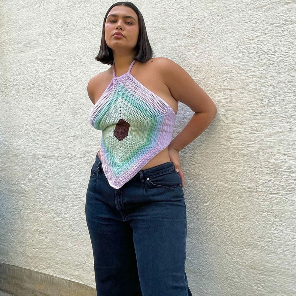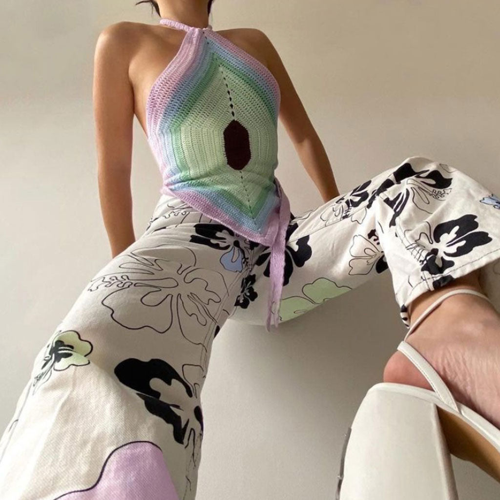 Vacation Ready Striped Panel Backless Knitted Halter Top - Multicolor