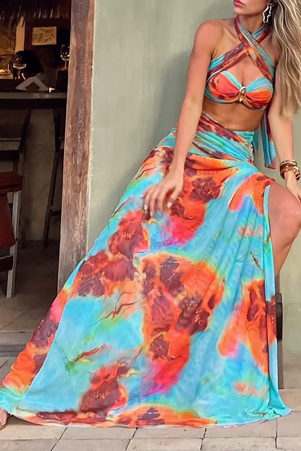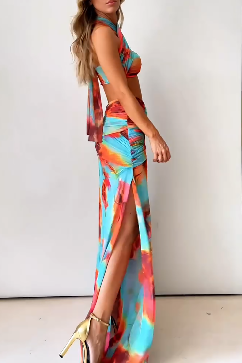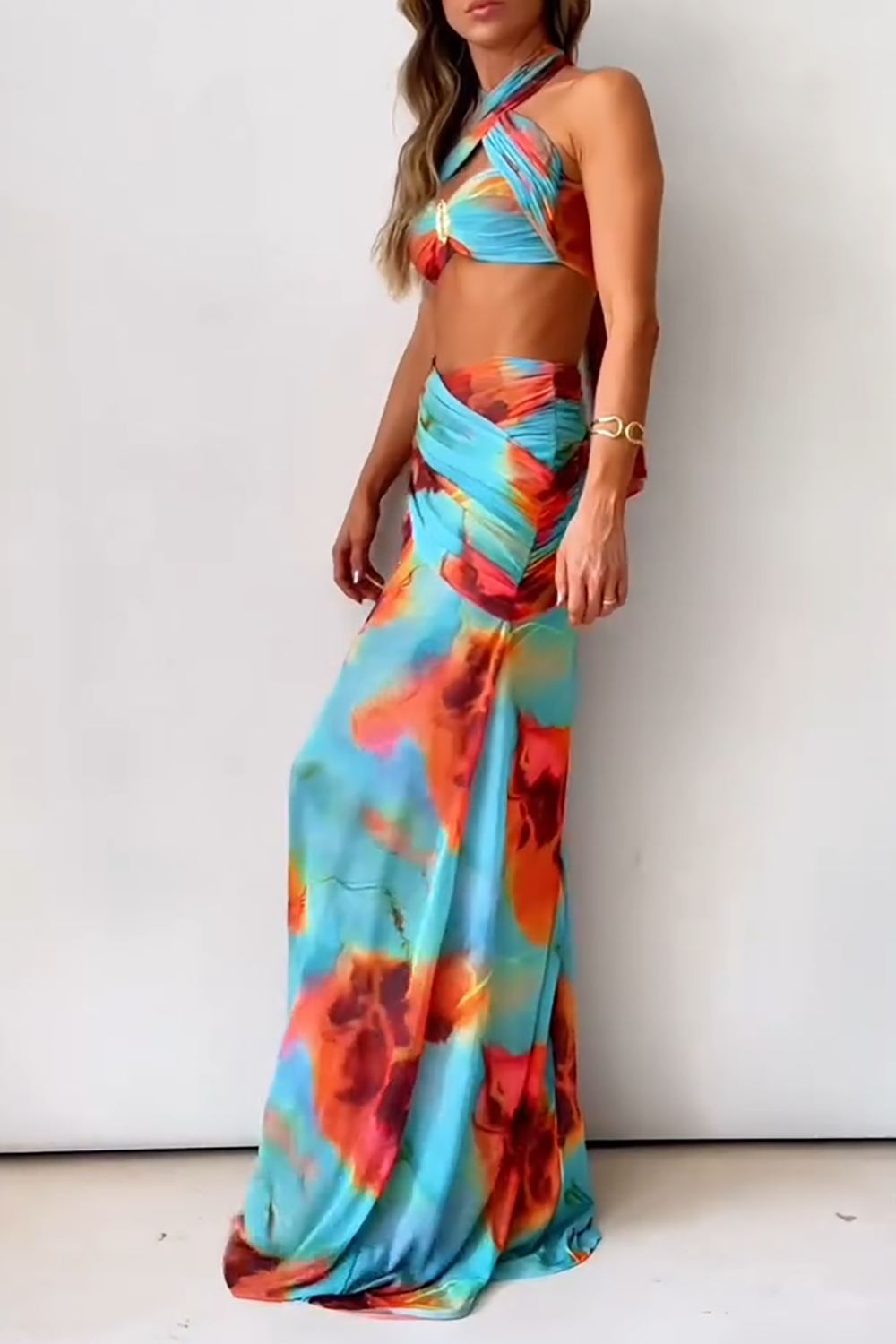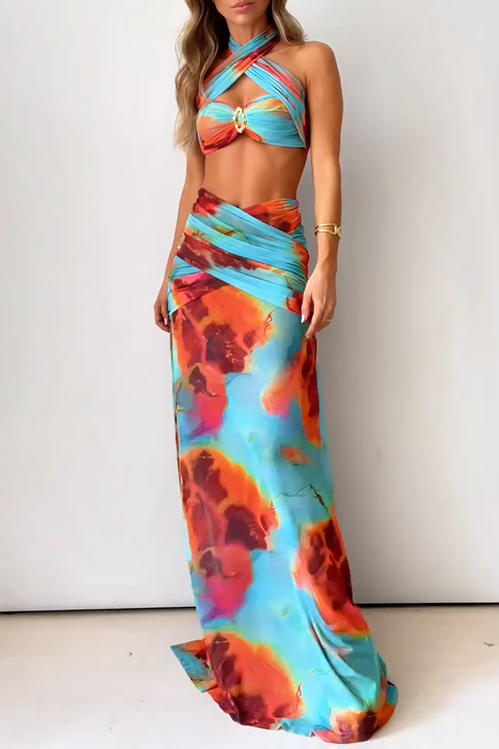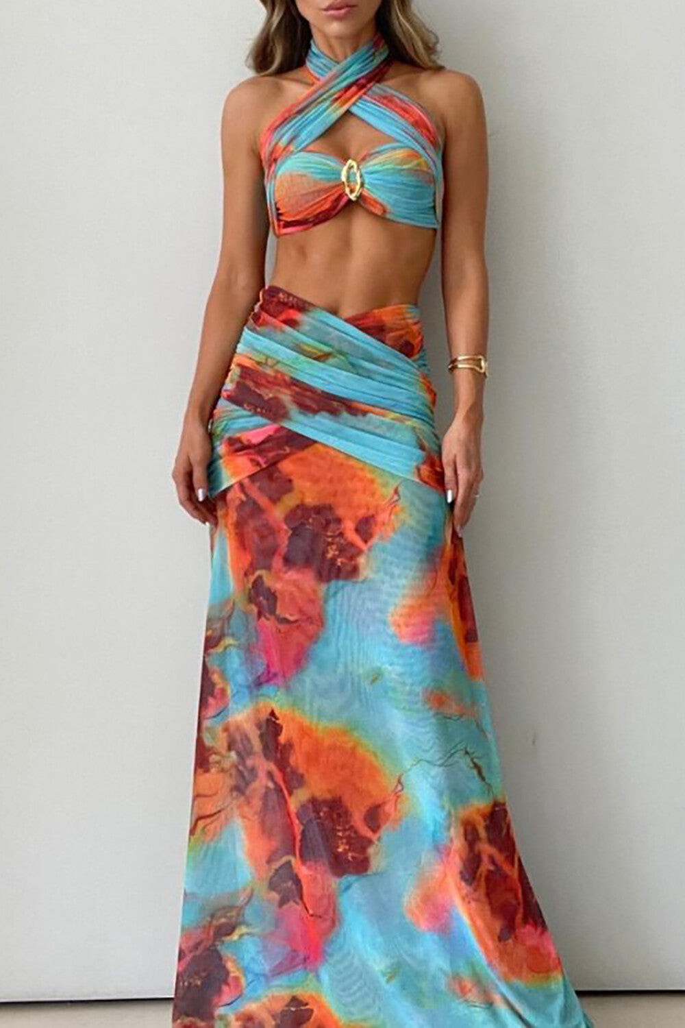 Abstract Print Halter Crop Top Side Slit Maxi Skirt 2pcs Set - Blue